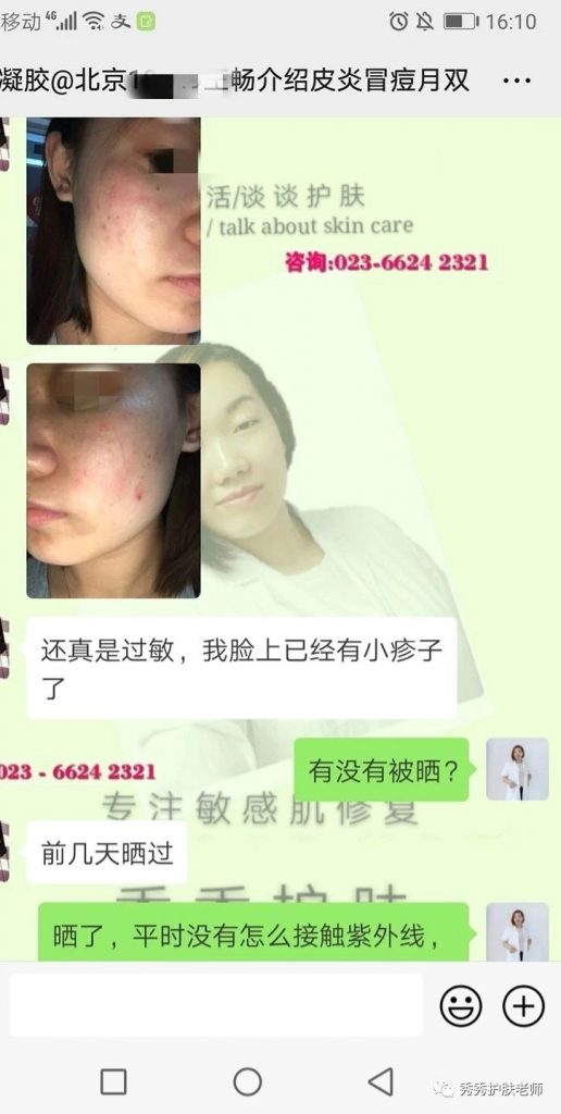 她当时是,我其中的一位学生用户介绍过来的,也是激素脸,2018年5月6号加的我微信。月双尝试过很多产品,还有药物,脸上问题一直反复,添加我微信后,还观察了接近两个来月,后来下定了决心修护。